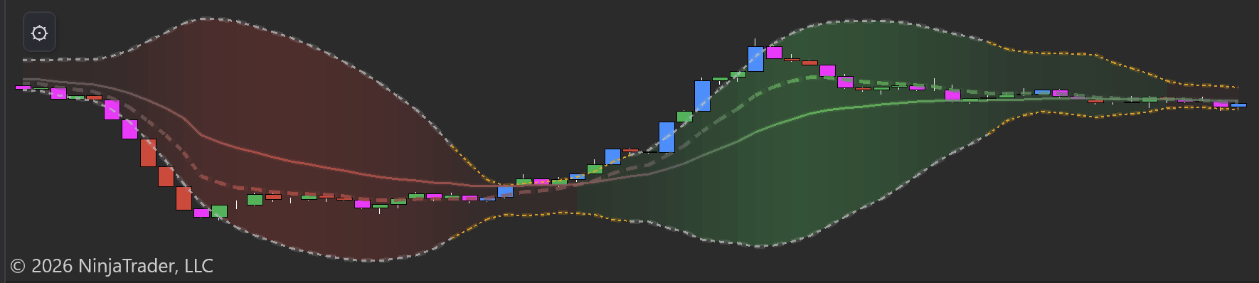 Both modes include Bollinger Bands, EMAs, and a built-in deltaDefinitionAsk volume minus bid volume. Positive = more buying. Negative = more selling. Shows who is more aggressive. squeezeDefinitionLow volatility compression — Bollinger Bands inside Keltner Channels. Expect an explosive move when it fires. detector. When the bands compress, aggressive volume is coiling — a directional explosion is coming.