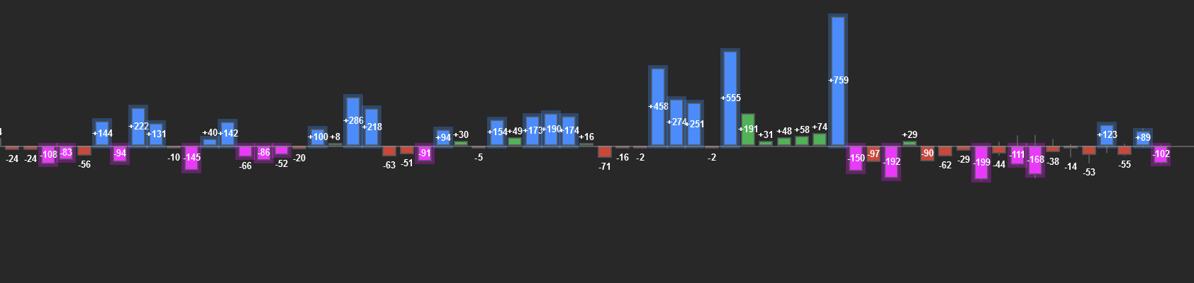 Cumulative deltaDefinitionRunning total of buying vs selling across the session. Shows who has been in control overall. tracks the running total of aggressive buying minus selling across the session. When price makes a new high but delta diverges — smart money is distributing. Delta barsDefinitionColored bars showing net buying vs selling per candle. Blue = buyers won. Red = sellers won. show the per-bar net aggression with exact numeric values, colored by imbalanceDefinitionA price level where one side overwhelms the other by 3:1 or more. Shows where big players committed. intensity.