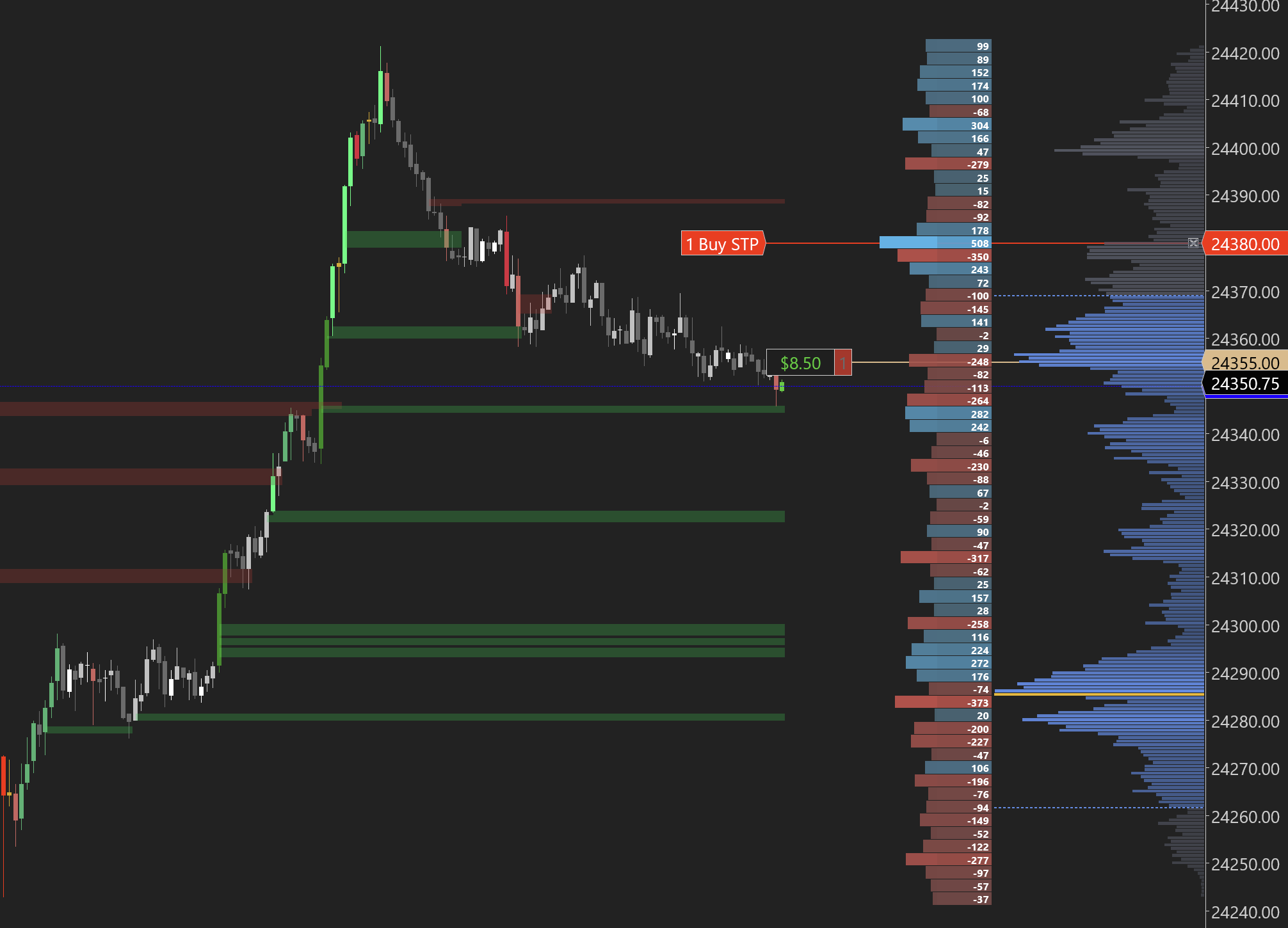 This answers the question that standard volume profiles cannot: not just where volume traded, but who was in control at each price. Use it to identify supply zonesDefinitionA price area where sellers previously overwhelmed buyers. Expect selling when price returns here. (heavy red) and demand zonesDefinitionA price area where buyers previously overwhelmed sellers. Expect buying when price returns here. (heavy blue) based on actual executed order flow.