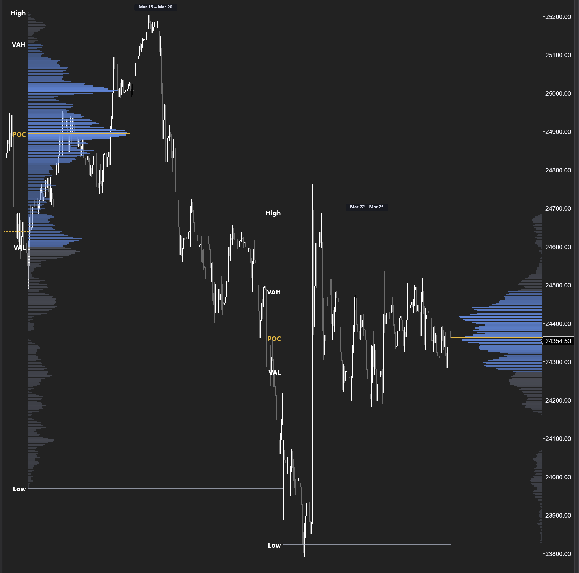 Volume Profile Session and weekly volume profiles with automatic Point of Control (POC), Value Area High (VAH), and Value Area Low (VAL). These levels reveal where the heaviest trading occurred — and where price is most likely to find support, resistance, or return to value.