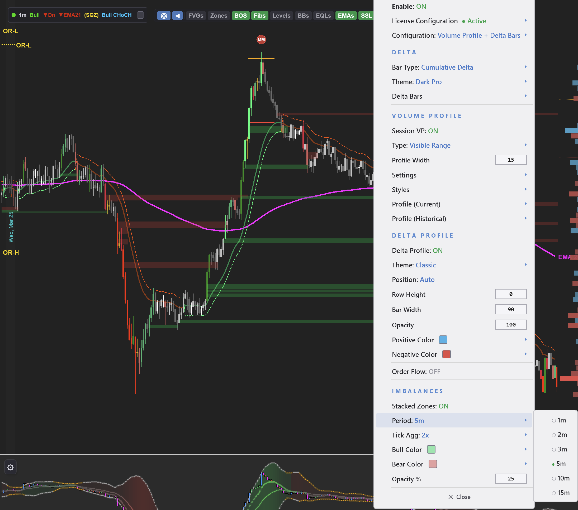 Choose from four bar styles: Bid x Ask for raw order flow data, Delta Profile for net buying vs. selling at each price, Volume ProfileDefinitionA histogram showing total volume at each price level. The widest bar is the POC. for volume distribution inside each candle, or VP + ImbalancesDefinitionA price level where one side overwhelms the other by 3:1 or more. Shows where big players committed. for the combination that highlights both volume concentration and aggressive activity.