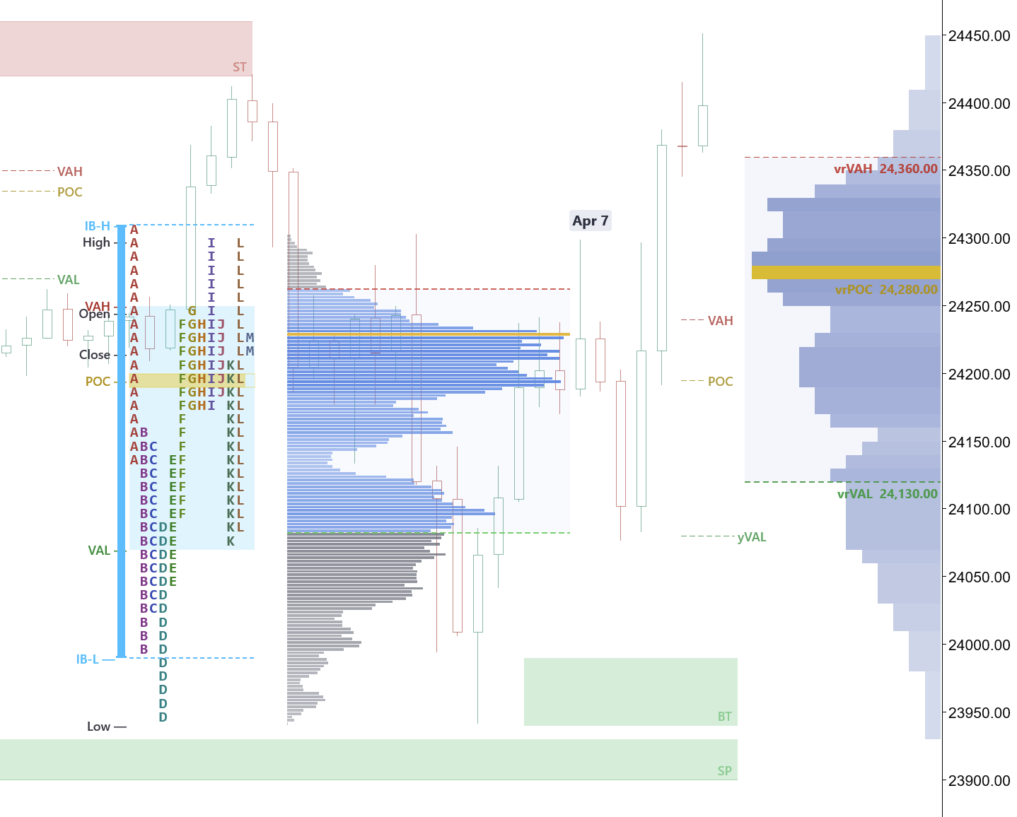 April 7 was the launch day. Price opened and immediately retested a single print zone left behind from a prior session. That retest held perfectly — buyers stepped in at the single printDefinitionPrice levels with only one TPO letter — price moved through quickly. Often act as support or resistance. level and formed a buying tail at the bottom of the profile.