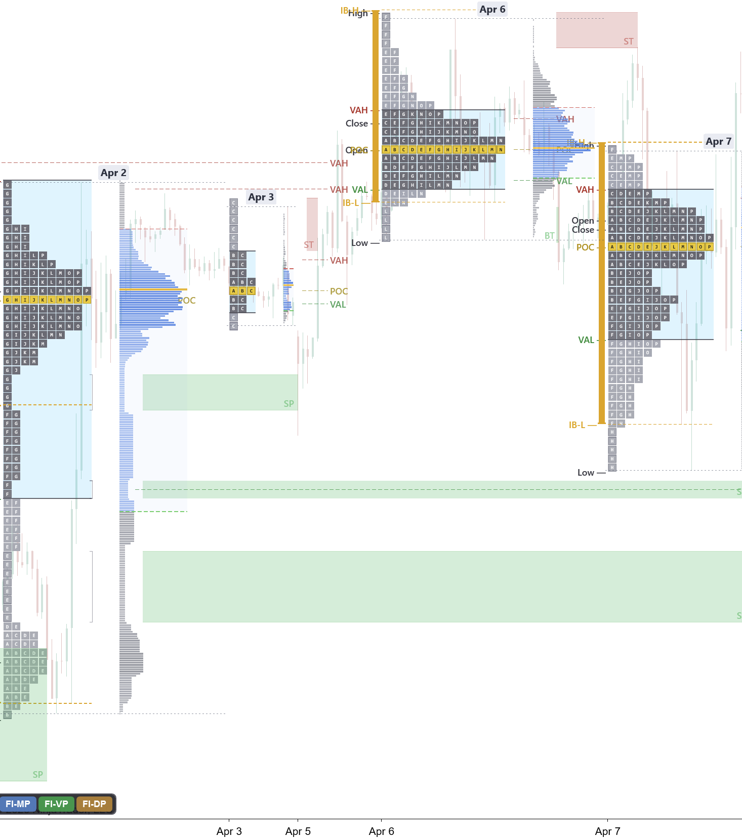 By April 7, you can see the entire staircase of value area migration — each day printing higher POCs, higher VAHs, and higher VALs. The green shaded zones mark the single printDefinitionPrice levels with only one TPO letter — price moved through quickly. Often act as support or resistance. areas that held as support throughout the week. Every time price retested a prior single print zone, it bounced.