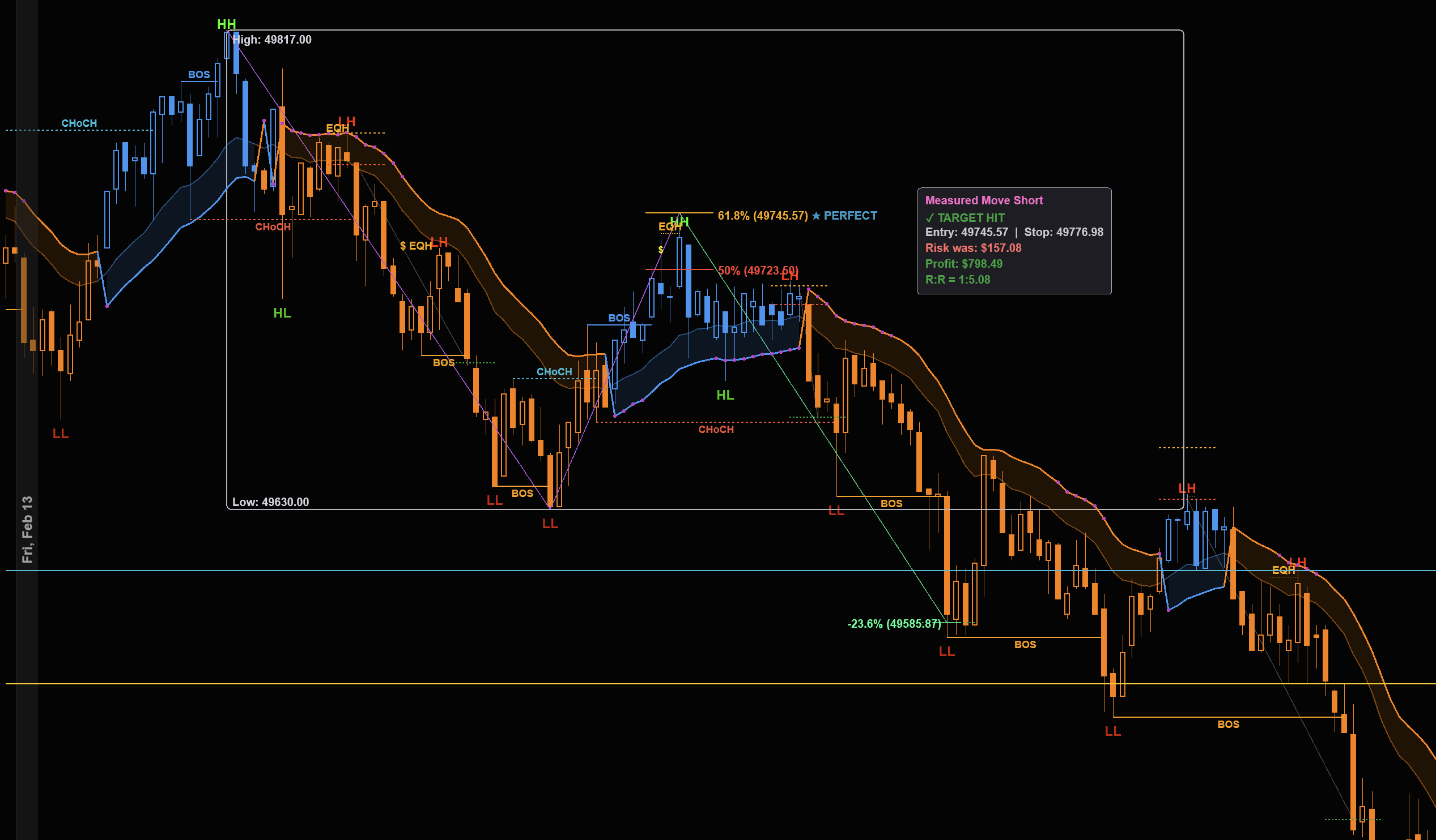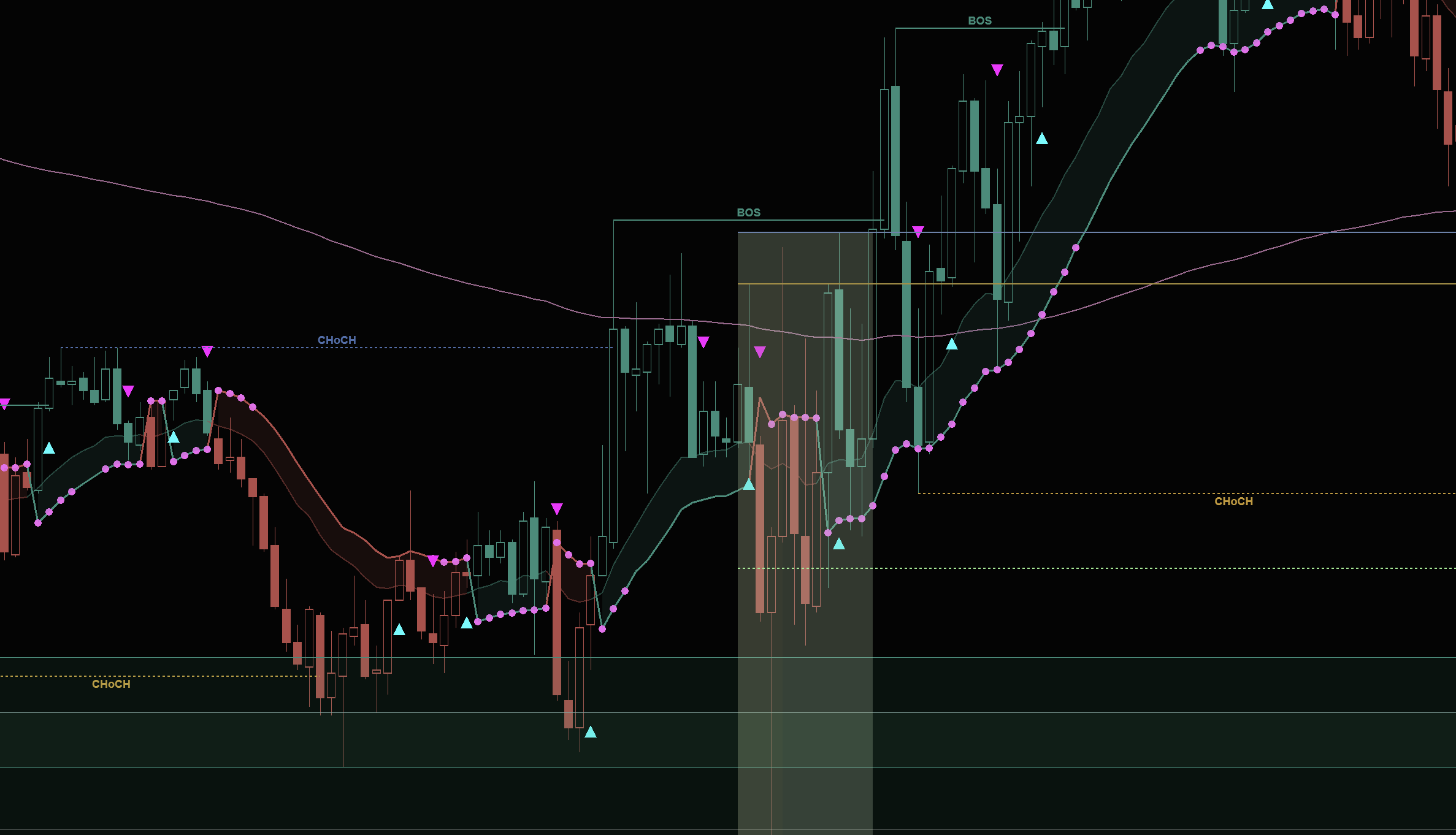 Here is a real example of how this plays out on the ES chart. Notice how the CHoCHDefinitionChange of Character — the first warning a trend may be ending. Price breaks a swing point against the trend. and BOSDefinitionBreak of Structure — price breaks the previous swing point in the trend direction. Confirms continuation. labels identify the structure shift, and then price trends cleanly with the SSLDefinitionSSL Channel — a trend-following overlay combining moving average crossovers with volatility bands for direction and entries. Cloud confirming direction: