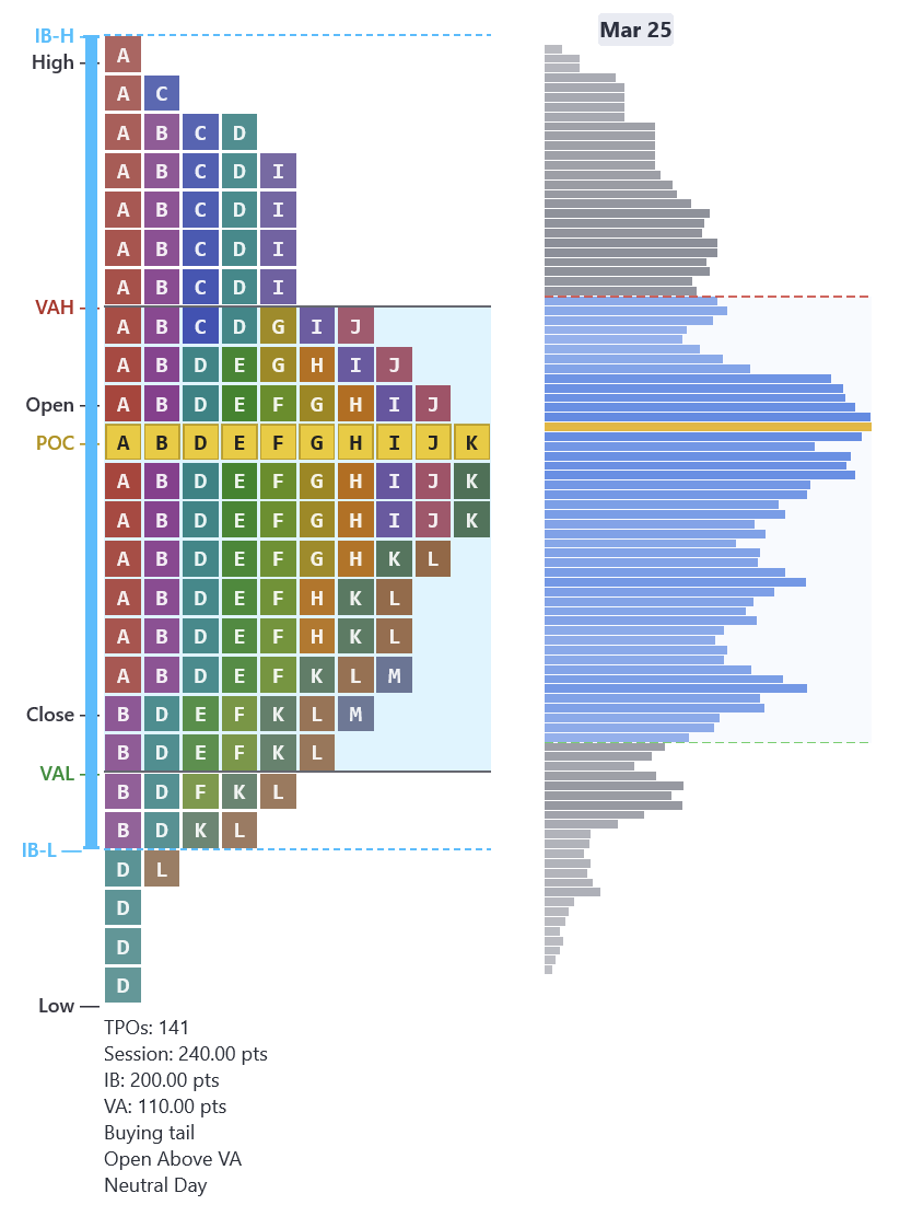 Here is a real MNQ D-shapeDefinitionBalanced Market Profile — symmetric bell curve. Two-sided trade, fair value accepted in the middle. from March 25. The profile is widest in the middle where the POCDefinitionPoint of Control — the price with the highest volume. Where the most trading happened. sits, with thin tails at both the high and low. The session range was 260 points with a 150-point IB and 110-point value area — a balanced, two-sided session where neither buyers nor sellers took control.