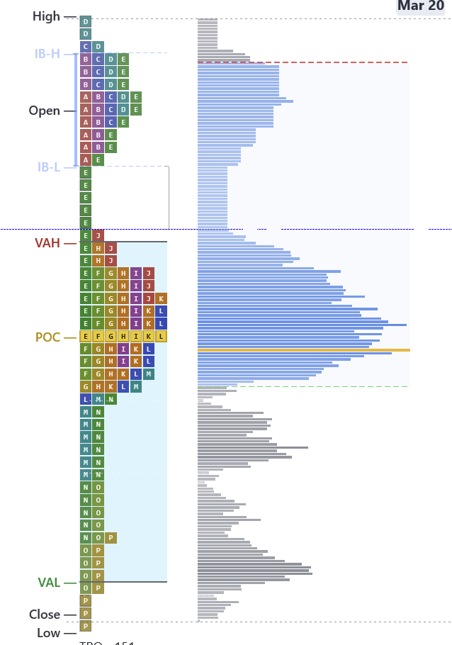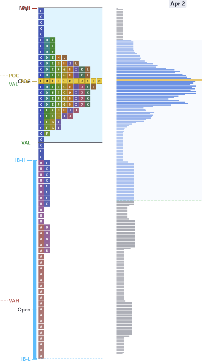 - Two clusters of activity separated by a thin zone of single printsDefinitionPrice levels with only one TPO letter — price moved through quickly. Often act as support or resistance on retest.