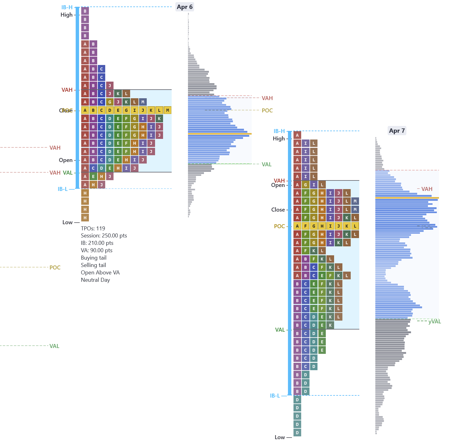 Market ProfileDefinitionA chart format using TPO letters to show how long price traded at each level. Reveals the shape of the auction. provides the map. The footprint provides the real-time intelligence. Use the profile to identify where you want to trade. Use the footprint to confirm whether you should actually take the trade.