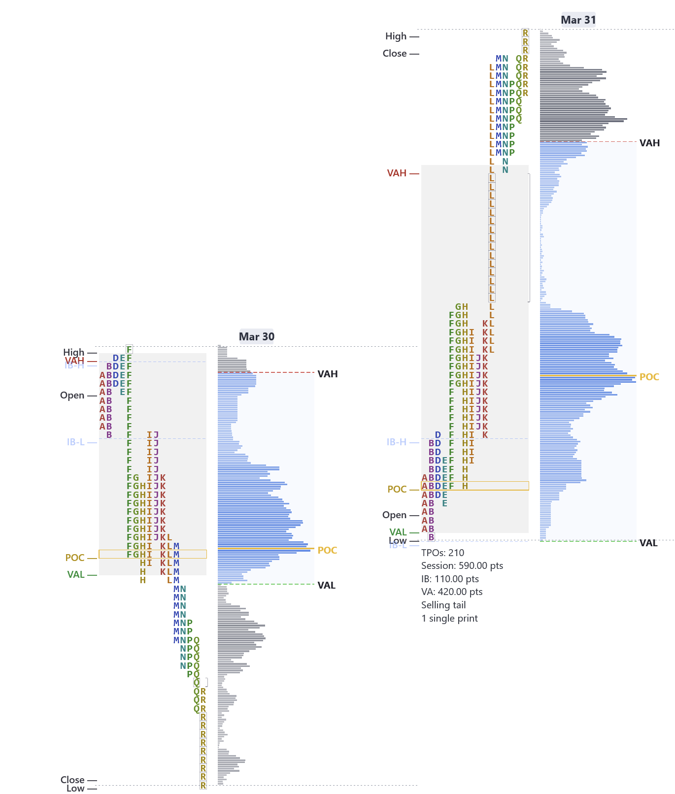 This is the same March 17-18 sequence we saw in the poor highs and poor lows section — the 80% RuleDefinitionIf price opens outside the Value Area but re-enters it, ~80% chance it travels to the other side. and the poor lowDefinitionProfile low with multiple TPOs but no single-print tail. Auction incomplete — price tends to revisit. retest worked together. When multiple profile signals align, the trade has the highest conviction.