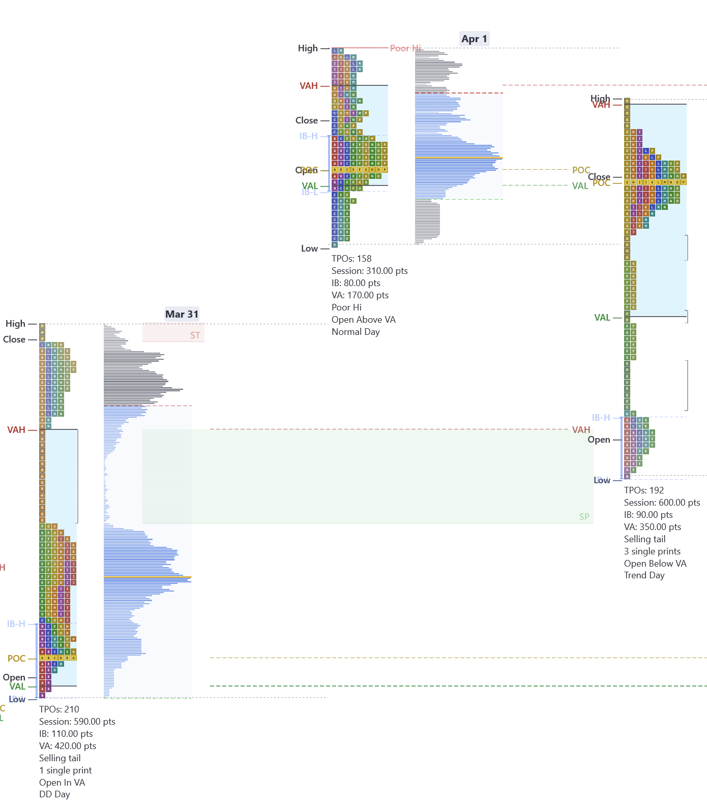 Here is a real example. March 31 MNQ is a double distributionDefinitionPhase 3 of Power of 3. The real move — Smart Money distributes into retail momentum. day (DD Day) with a single printDefinitionPrice levels with only one TPO letter — price moved through quickly. Often act as support or resistance on retest. zone (green shaded area marked SP) between the two value clusters. The next session opens below the prior VA and trends down — when price reaches the single print zone, it moves through quickly because that zone was never accepted as value. The indicator highlights single print zones automatically so you can see exactly where these initiative levels are.
