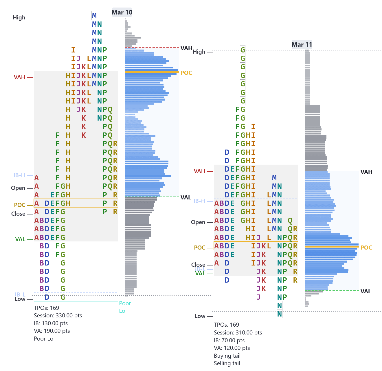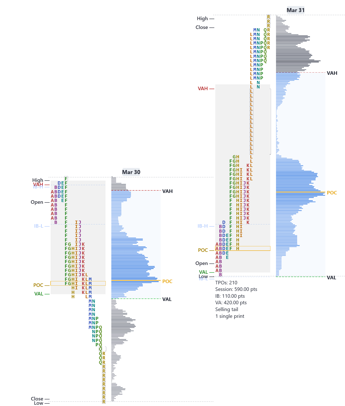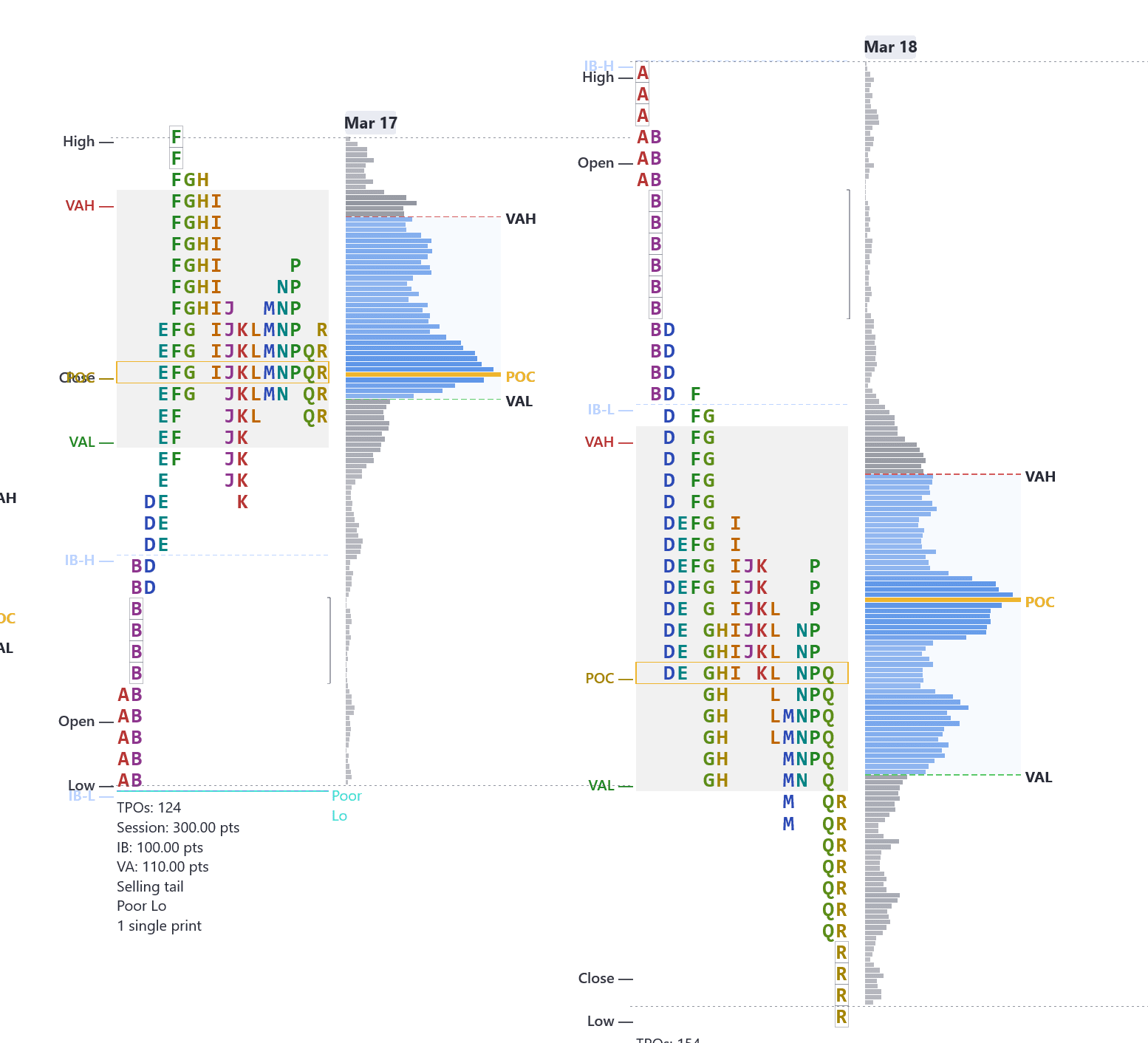 TPO charts with IB, profile shapes, and poor highs/lows