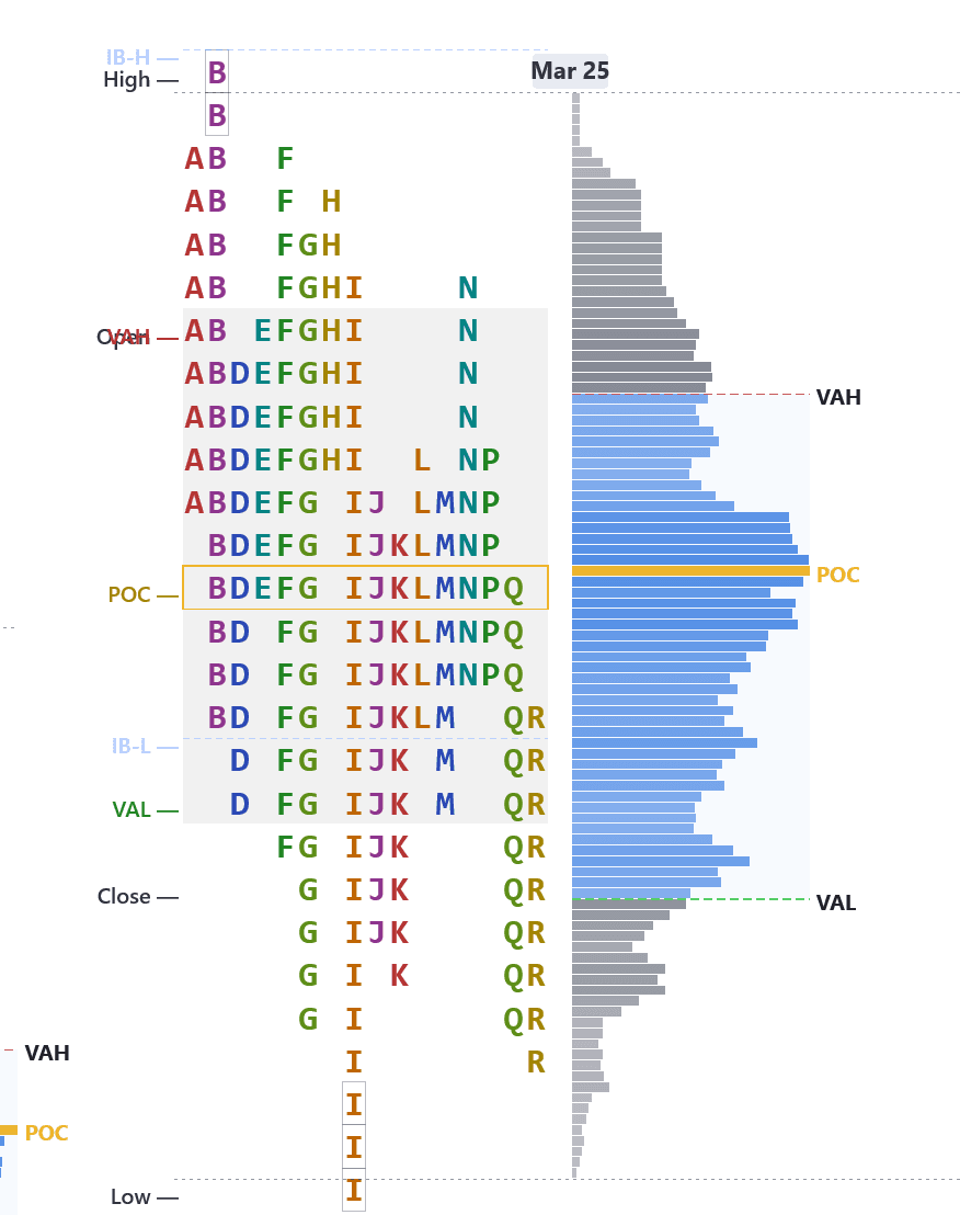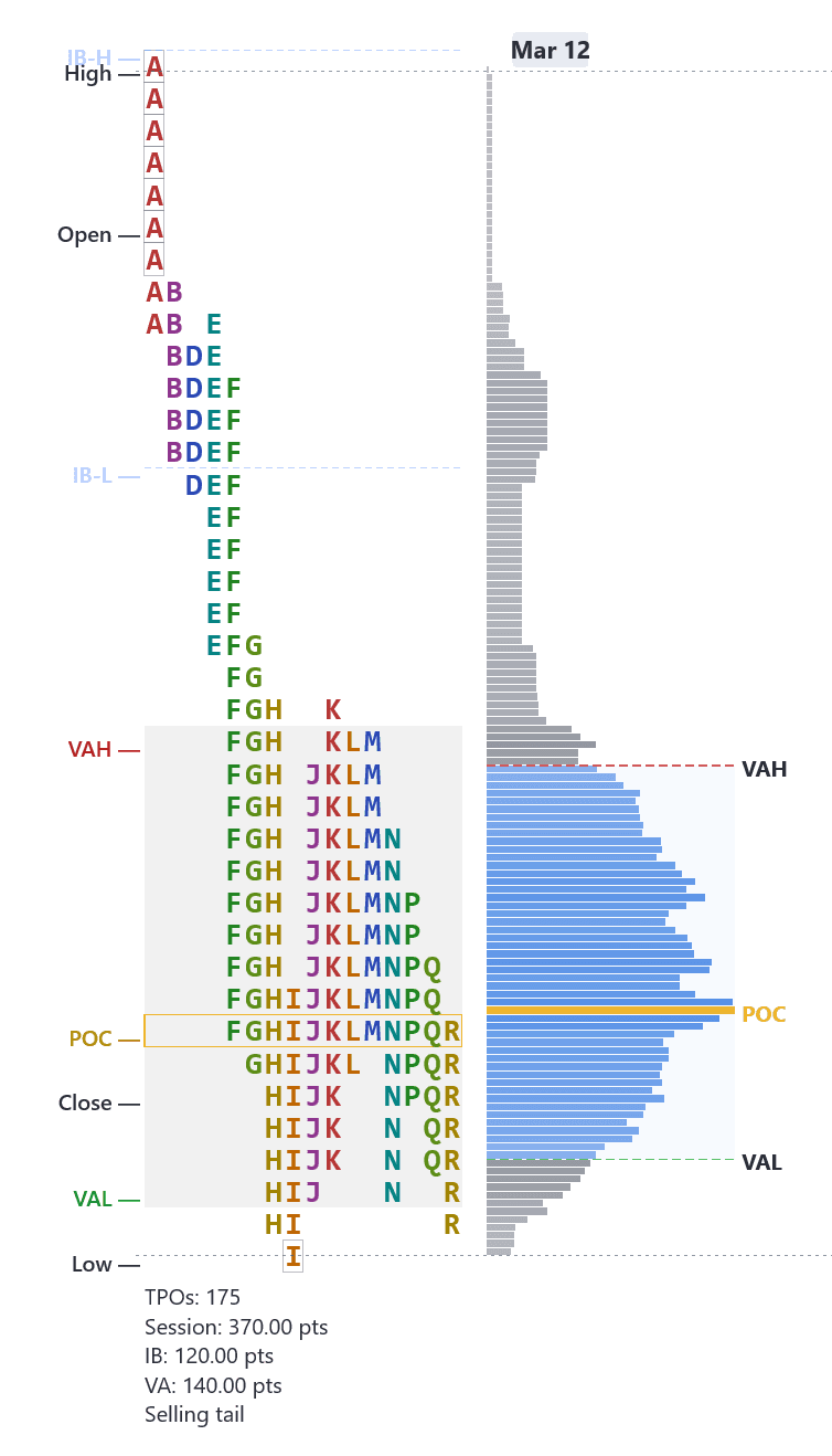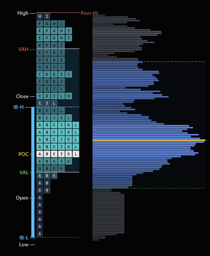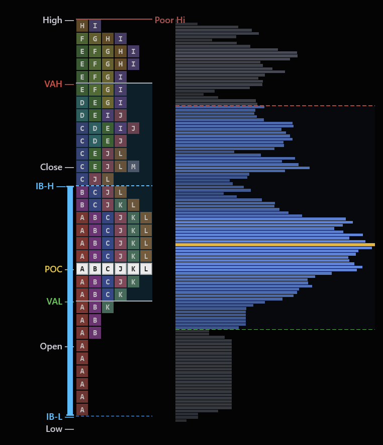 Standard charts show you where price went. Market Profile shows you where price stayed. By organizing each 30-minute period into TPO letters that stack at every price level, you can see the session's story at a glance — where value was accepted, where the market moved through quickly, and where the auction is still incomplete.