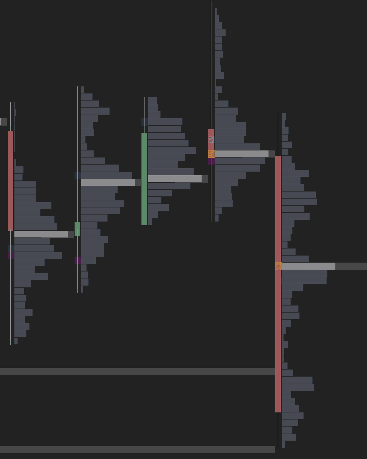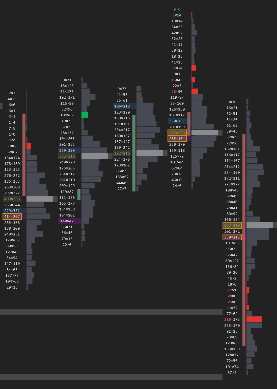 Combines the volume profile with imbalance markers. Red and green indicators along the profile highlight levels where buying or selling was disproportionately aggressive — the exact price levels where the market showed its hand.