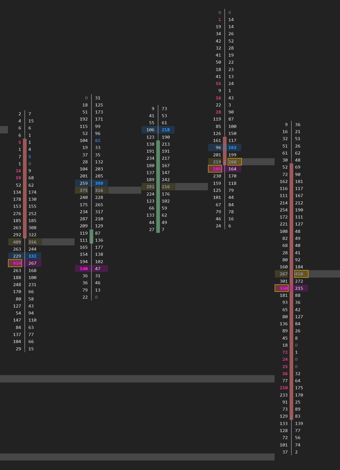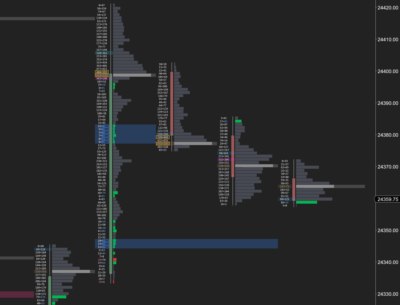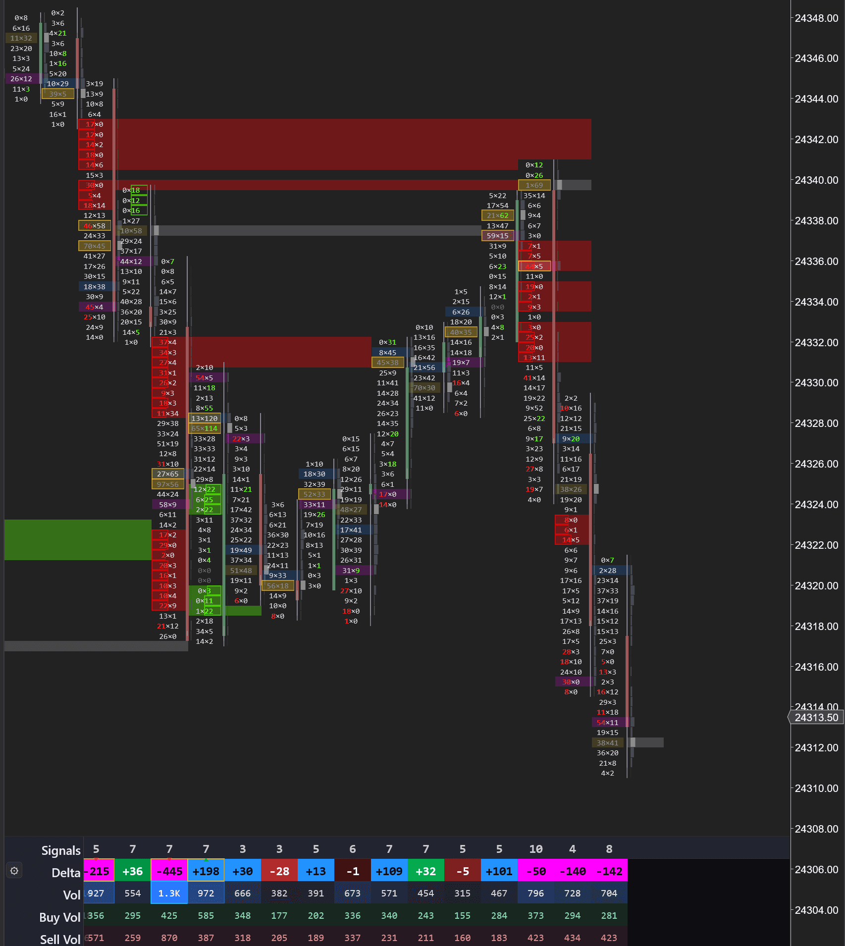 The classic footprint view. Left column = volume at the bid (sellers), right column = volume at the ask (buyers). Highlighted rows show imbalances where one side dominates by 3:1 or more — the signature of aggressive institutional activity.