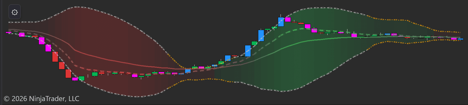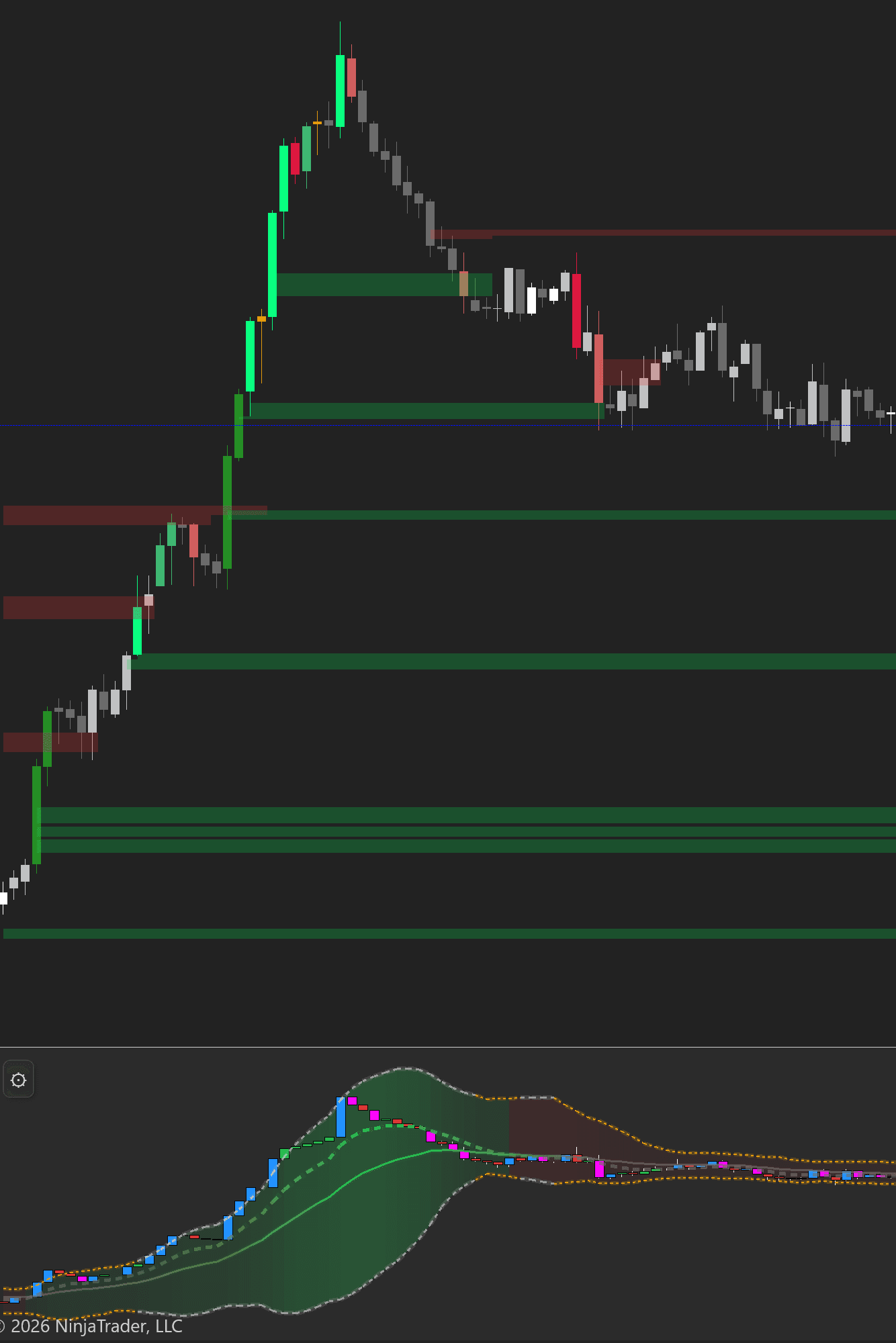 The cumulative delta flows as a multi-colored ribbon beneath your chart with Bollinger Bands and EMAs. Rising ribbon = net aggressive buying is increasing. Falling ribbon = net aggressive selling. The colored bands make divergences between price and delta immediately visible — essential for spotting distribution at tops and accumulation at bottoms.