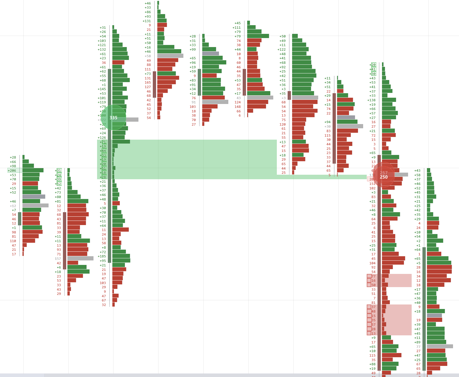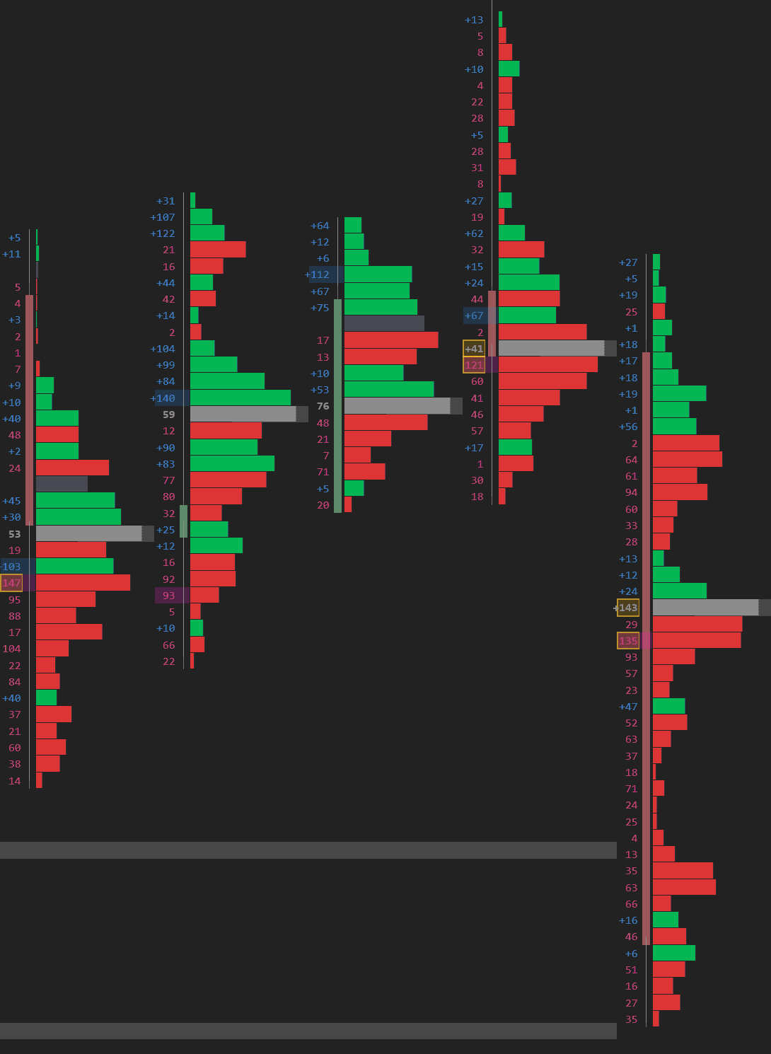 Each row displays the net delta (ask volume minus bid volume) as a colored horizontal bar. Green = net buying, red = net selling. See at a glance which price levels attracted aggressive directional flow.