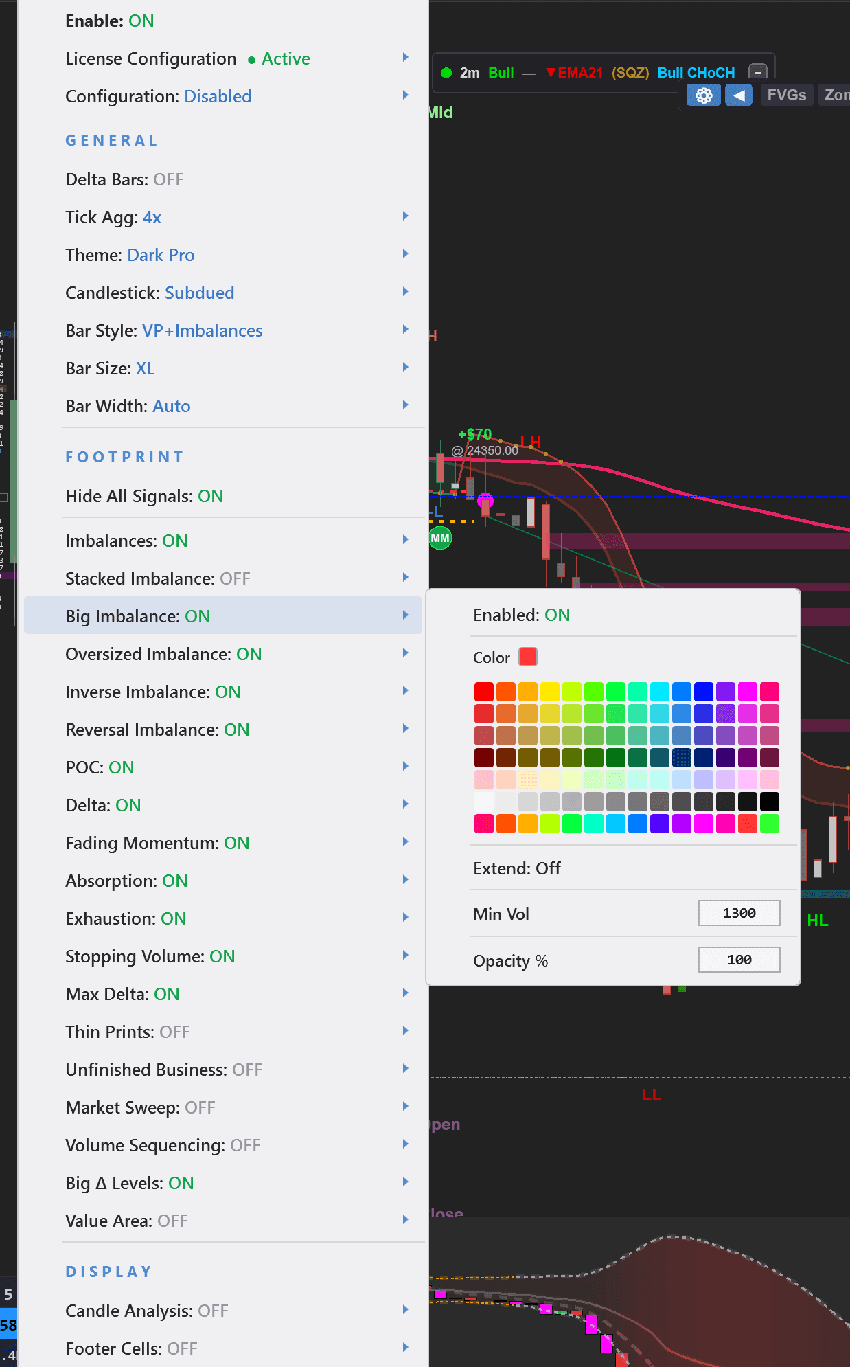 Not every session calls for a full footprint chart. Maybe you just want stacked imbalance zones on a clean candlestick chart. Maybe you want cumulative delta with a volume profile but no footprint bars. Every combination works — toggle any feature on or off from one unified menu. This is not five separate indicators duct-taped together. Every feature shares the same data pipeline, the same menu, and the same license.