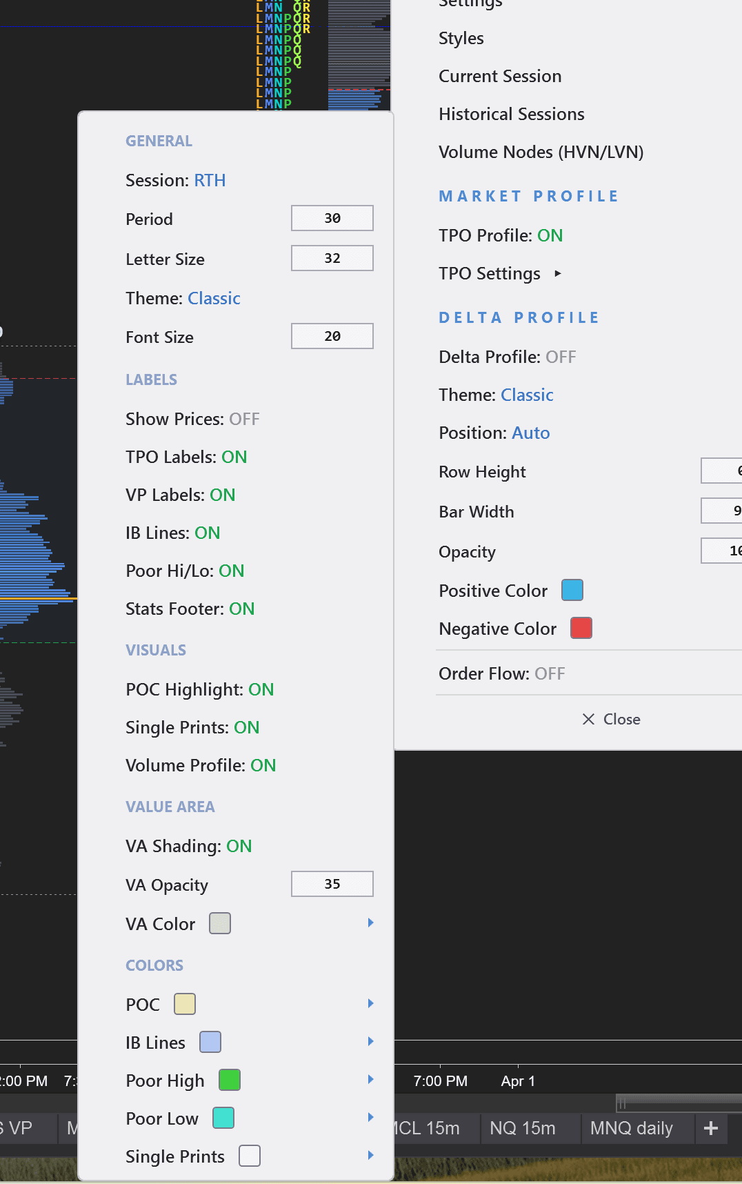 Volume Profile (session/weekly/visible range), Market Profile (TPO), Delta Profile — all with independent colors, width, and opacity