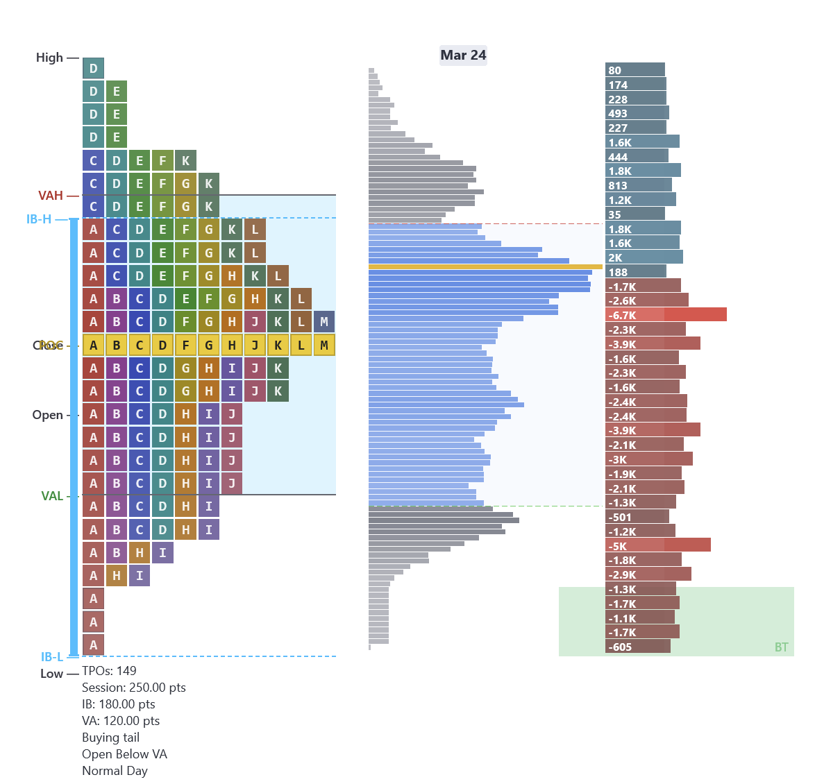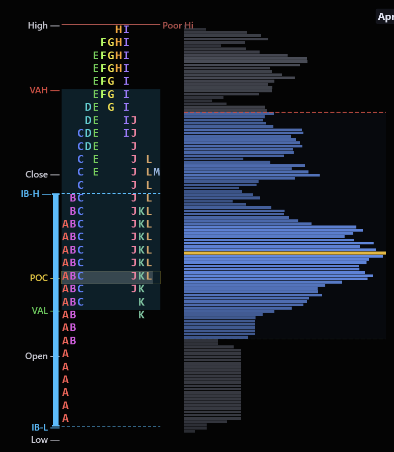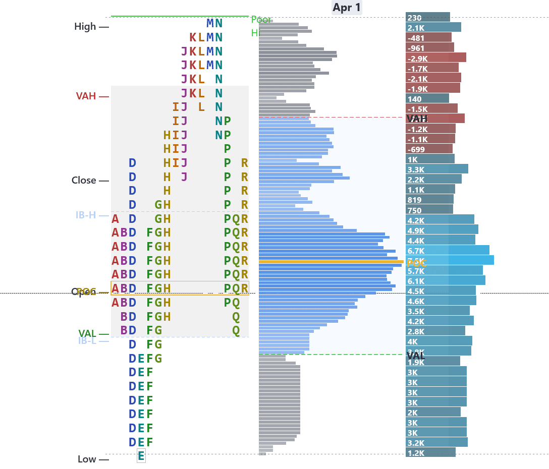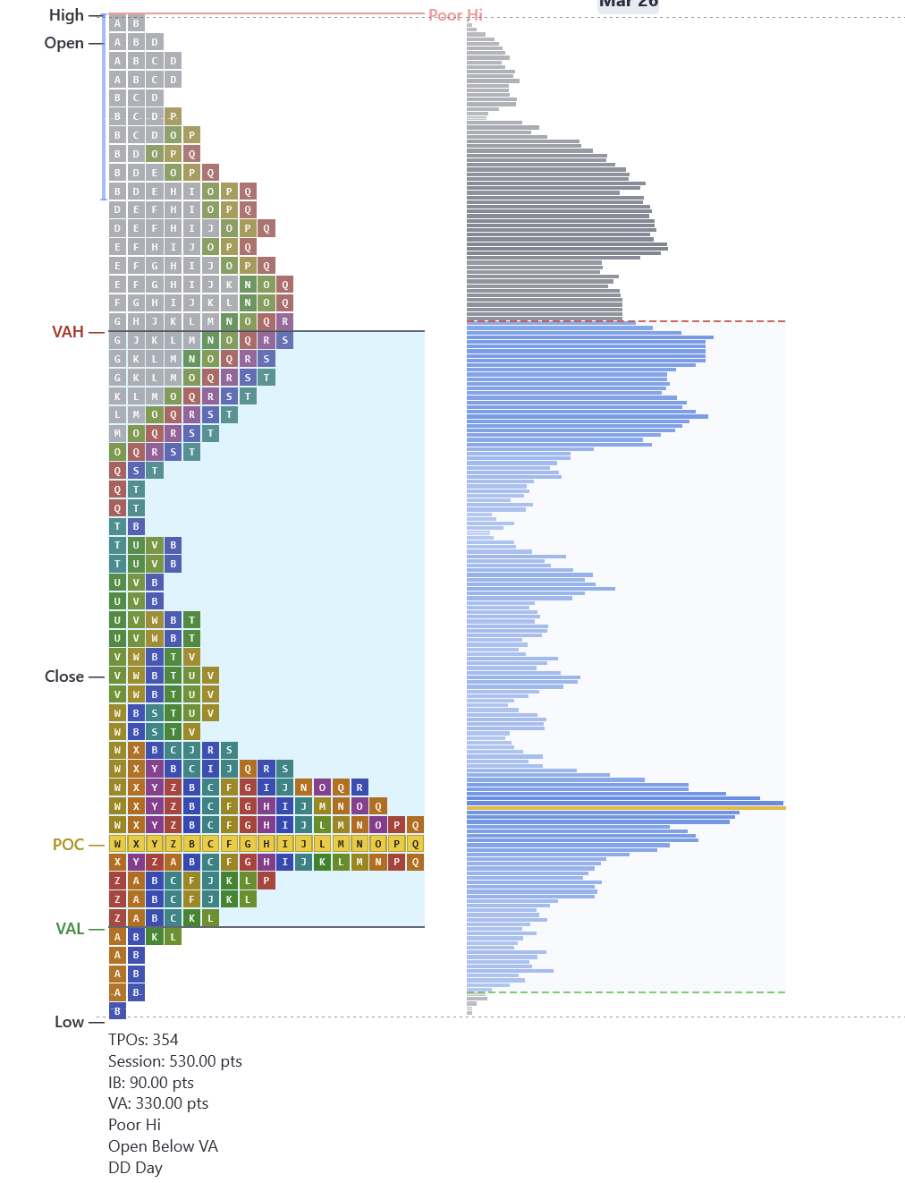 - Profile shape at a glance — D (balanced), P (rally), b (sell-off), or double distribution