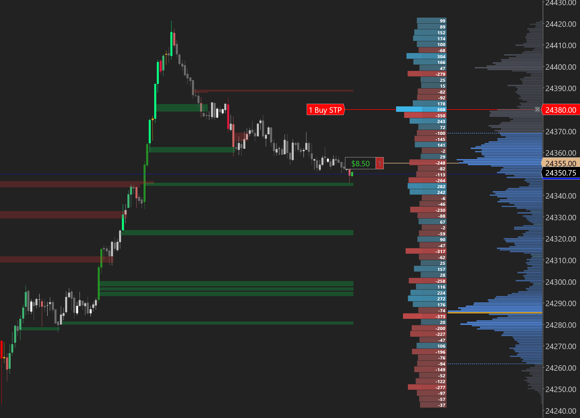 These zones are significant because they represent prices where one side of the market committed heavily. When price returns to a stacked buying imbalance zone, remaining passive buy orders may still be resting there — creating support. Stacked selling imbalances mark prices where heavy selling occurred and often become resistance.