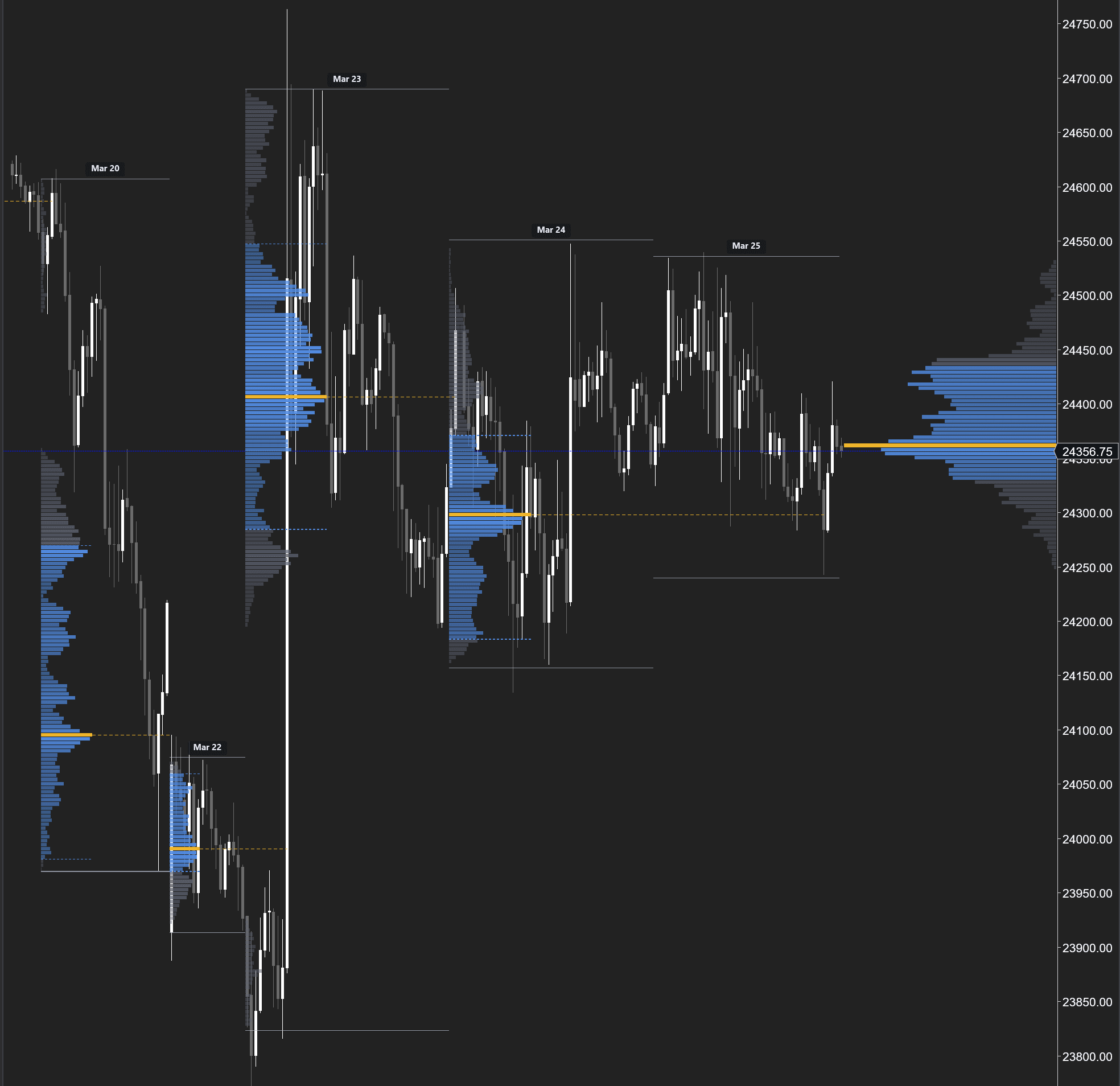Volume profiles for each session with POC marked as a yellow horizontal line. Identify where volume concentrated during each session — these levels become intraday support and resistance. When price revisits a prior session's POC, watch for a reaction.