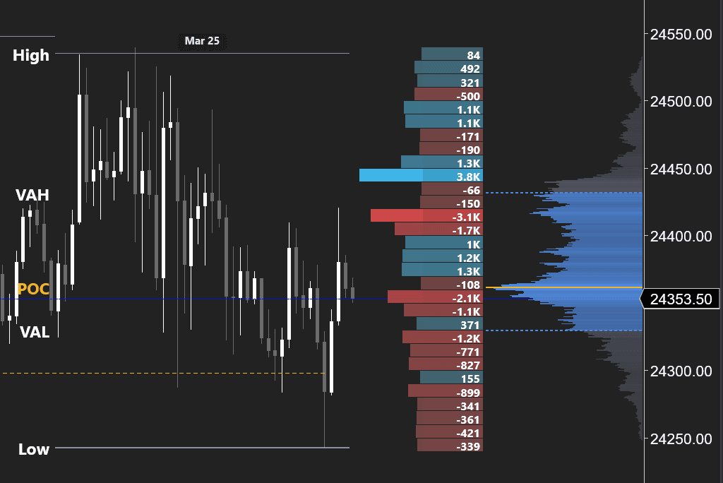 This gives you a complete picture of the battleground. Prices with heavy volume and net buying are levels where buyers have established a position — they'll likely defend it. Prices with heavy selling mark supply zones. When price approaches a high-volume, high-delta level, expect a strong reaction.