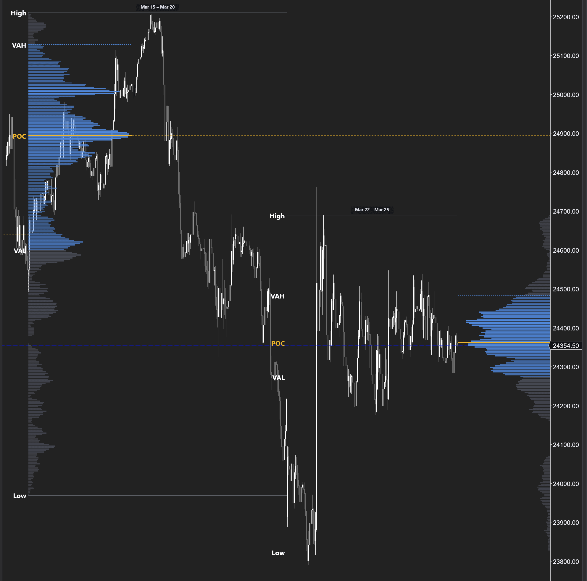 Session & weekly volume distribution with POC/VAH/VAL