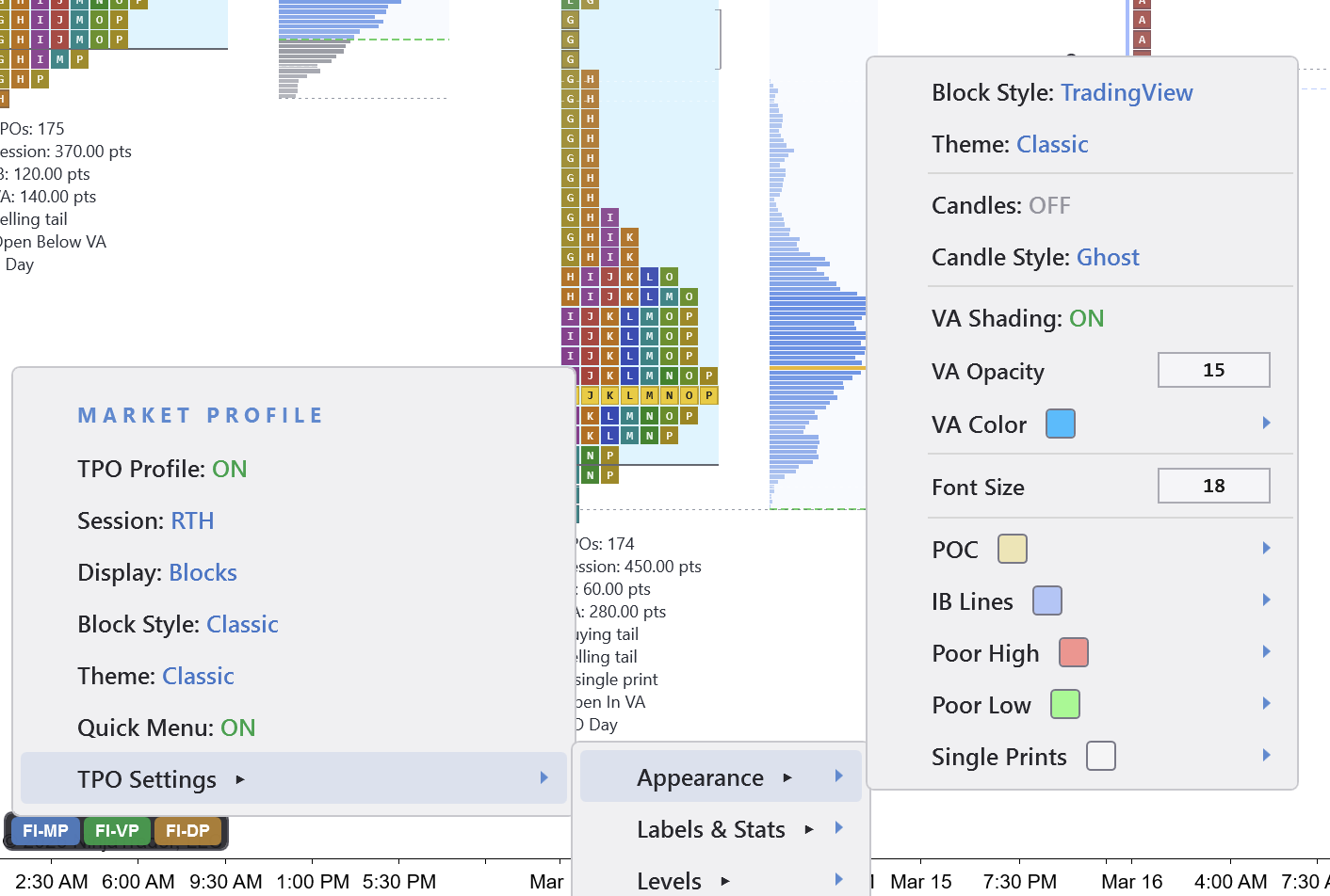 The indicator automatically plots the full TPO profile with POC, Value Area, Initial Balance, poor highs and lows, and single prints — all labeled on every session. Profile shapes, open type, and day type classification become immediately visible.