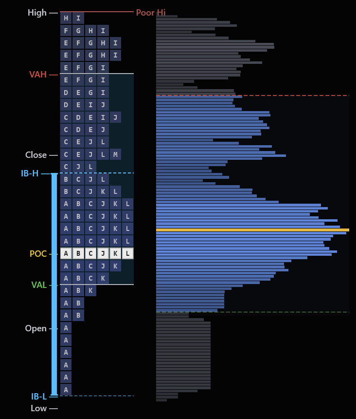 A poor low is when the bottom of the profile has multiple TPO letters stacked with no clean single-print rejection — the auction never finished. The market will come back to complete the job. A poor high is the same concept at the top.