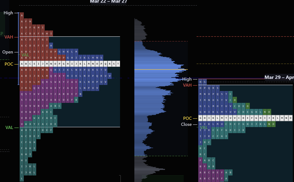 Use weekly composite profiles to set your bias for the day. If price opens inside the prior week's value area, expect rotation. If it opens outside, look for a trend day back toward the POC or continuation away from value.