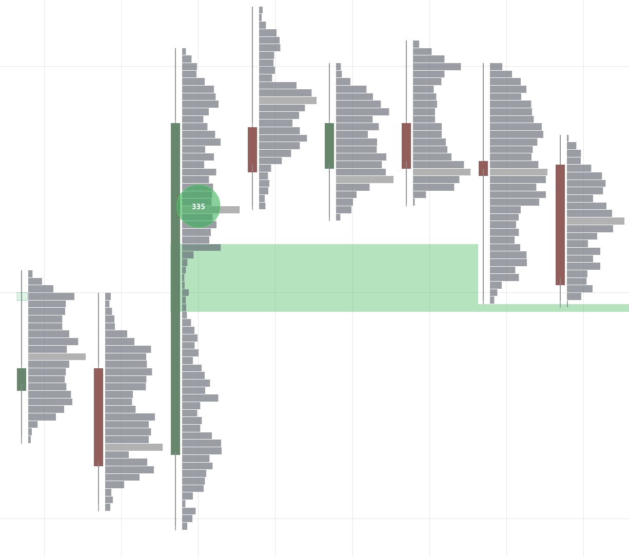 A clean volume-at-price histogram inside each candle with bubble markers highlighting big trades. The widest bar is the Point of Control (POC) — the single price level where the most volume traded within that bar. Bubbles make it easy to spot where large orders hit the market at a glance.